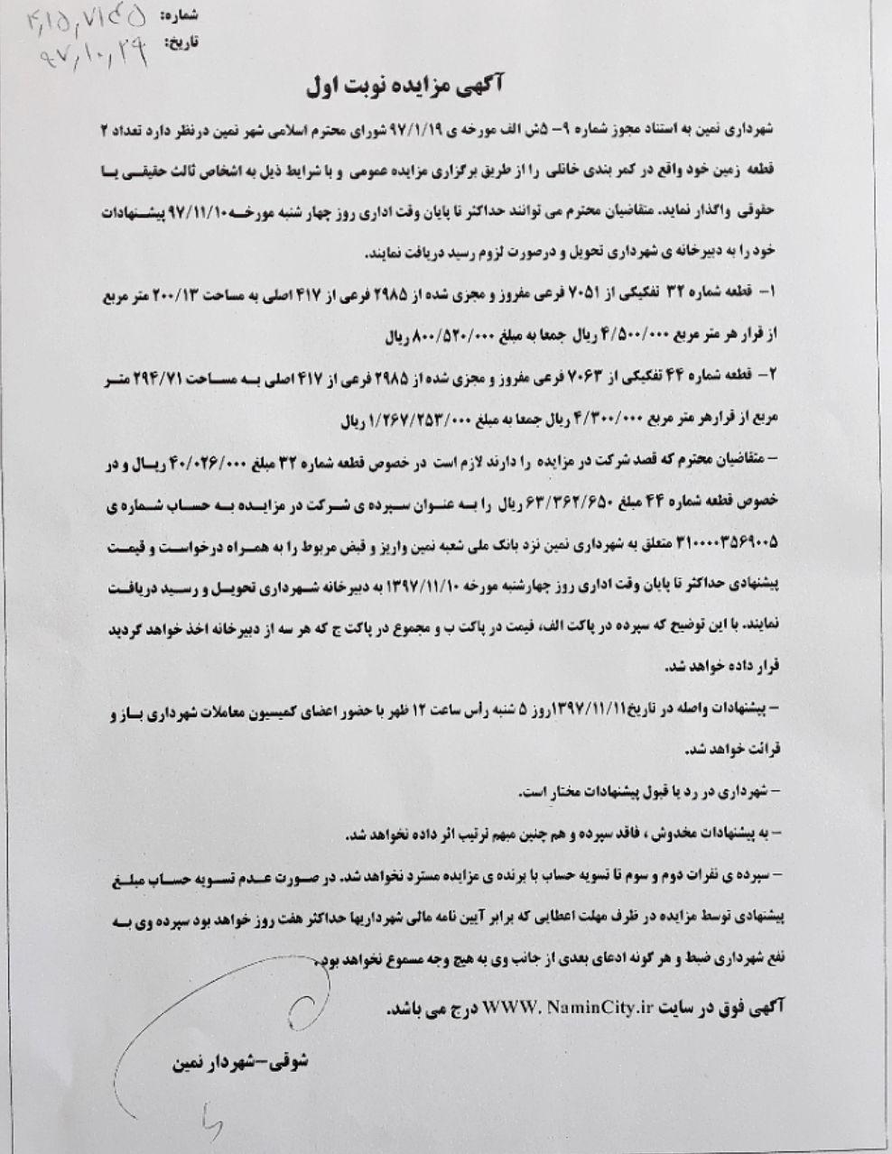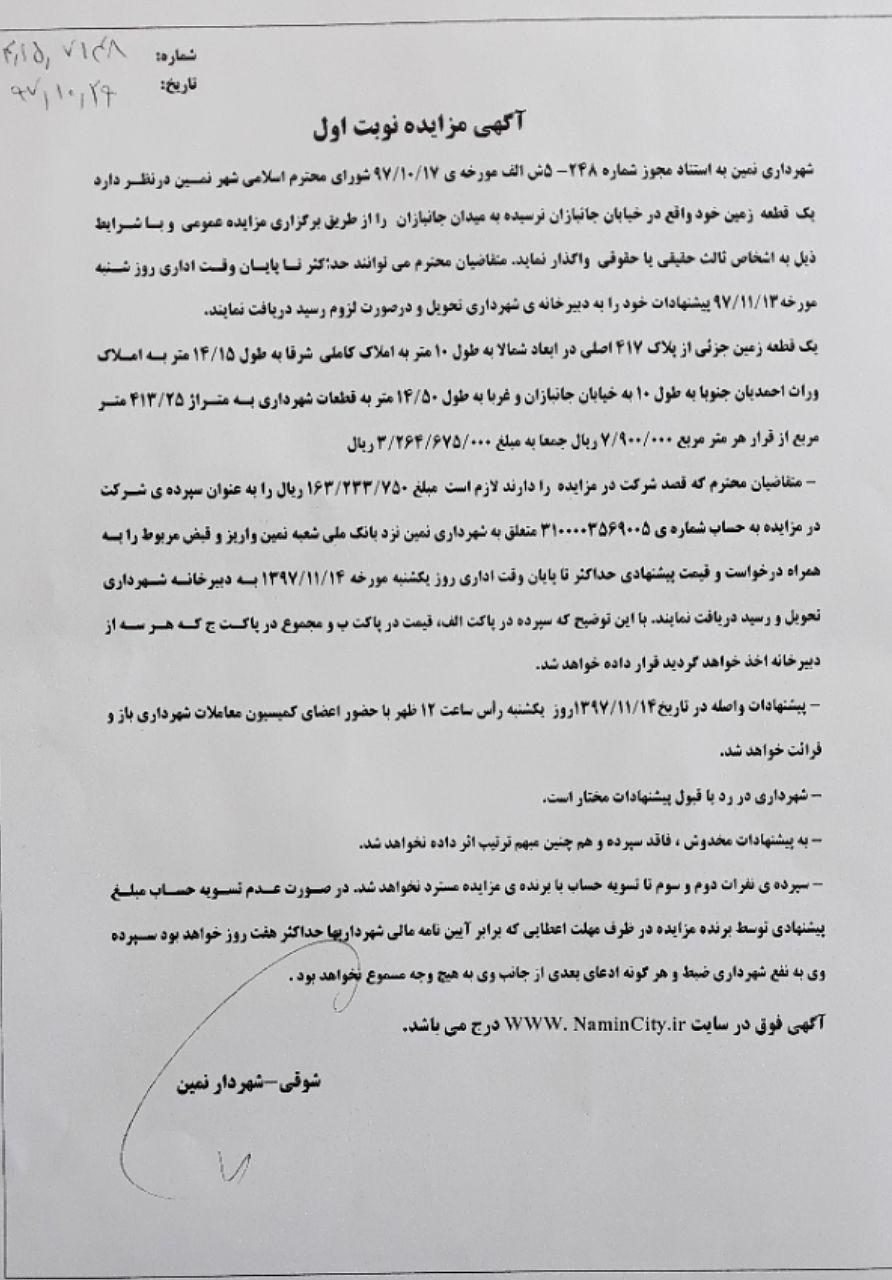 آگهی مزایده نوبت اول واگذاری قطعات مسکونی واقع در بلوار فرهنگ